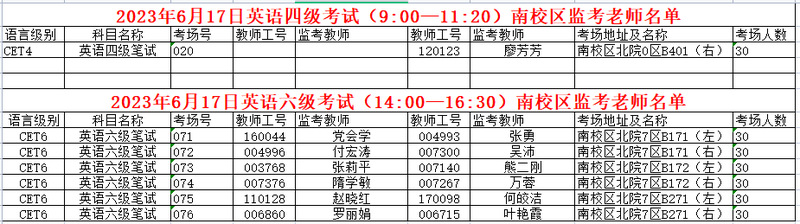 2023年6月17日全国大学生四六级考试南校区监考安排具体如下: