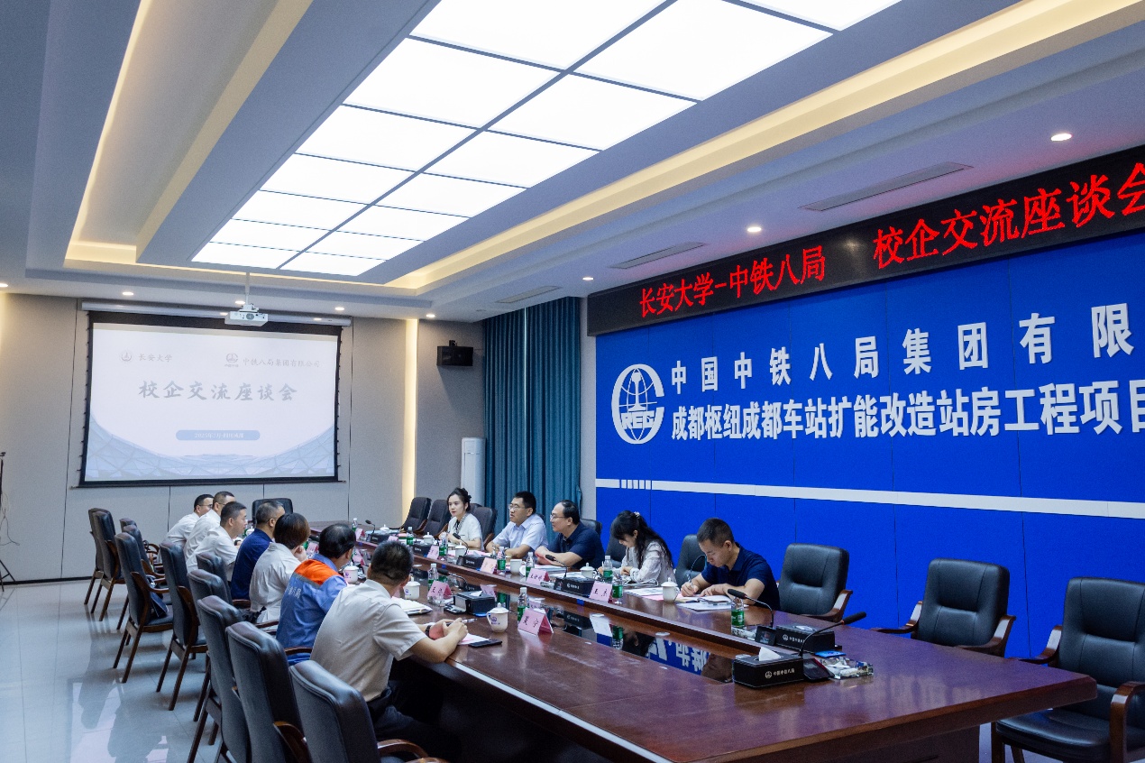 在中铁八局成都车站升级更新项目现场,工作组参观室内钢筋加工厂、“北站记忆”展厅、智慧展厅,项目负责人详细讲解大跨度结构施工、已有线路保护等施工难点与关键技术。座谈会上,中铁八局人力资源部(党委干部部)副部长胡方平介绍企业规模与人才培养体系,提出“将企业精神融入学生培养”的合作愿景。吴涛、贾侃结合学院人才规模与专业布局,希望校企协同破解人才培养与产业需求衔接难题。马熠航、王妍婷进一步梳理学生群体特征,为校企精准优化就业合作锚定方向。