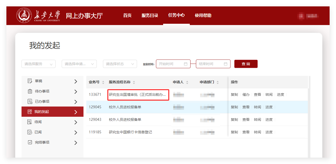 第四步:我的发起-找到研究生出国境审批(正式派出前办理)-最右侧点击“进度”。