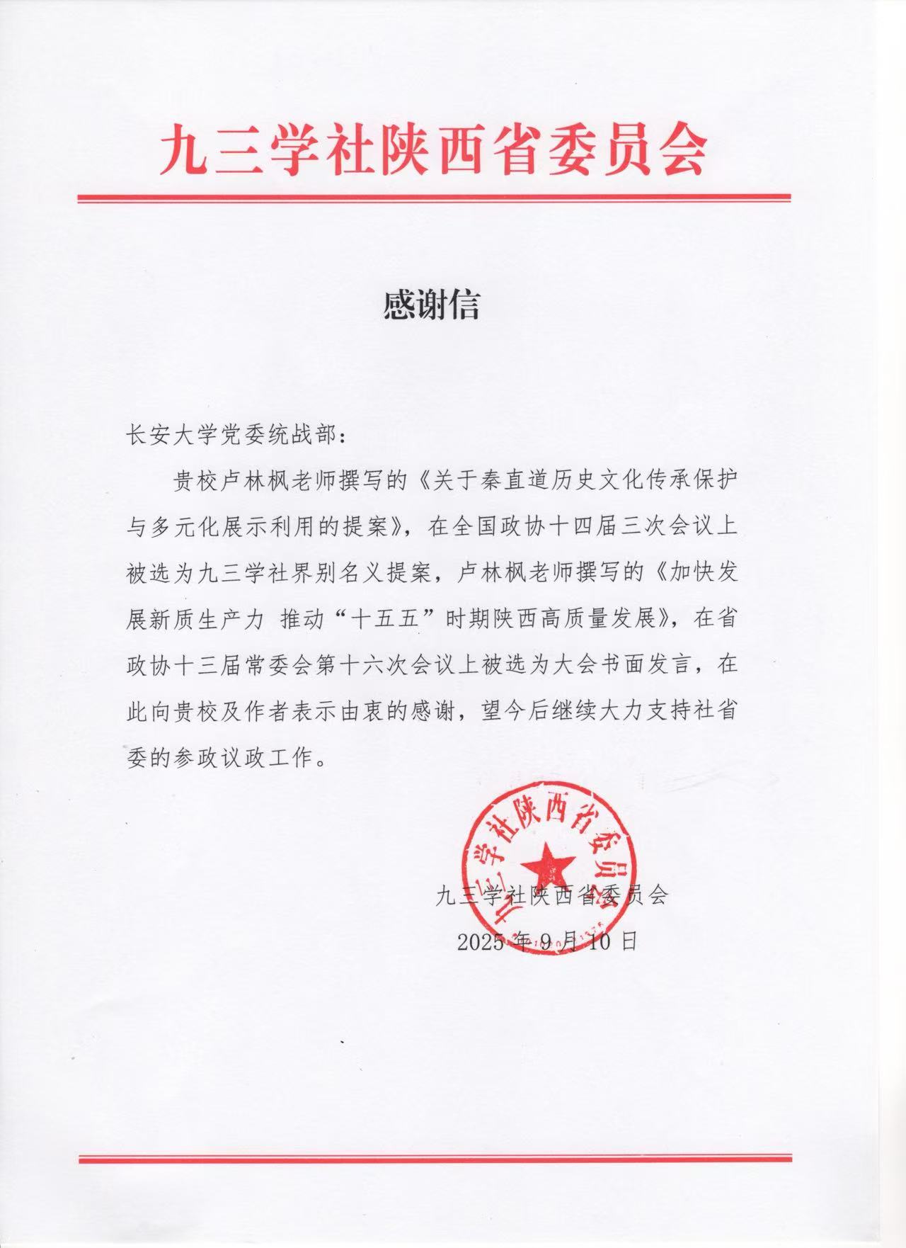 卢林枫教授撰写的《关于秦直道历史文化传承保护与多元化展示利用的提案》,在全国政协十四届三次会议上被选为九三学社界别名义提案,撰写的《加快发展新质生产力 推动“十五五”时期陕西高质量发展》,在省政协十三届常委会第十六次会议上被选为大会书面发言。在九三学社陕西省委员会致长安大学党委统战部的感谢信中,向长安大学及卢林枫教授表达了由衷感谢,并希望未来能继续支持社省委的参政议政工作。